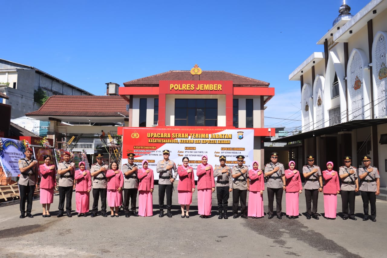 Prosesi Sertijab diawali dengan pengambilan sumpah jabatan, dilanjutkan penandatanganan berita acara, hingga penyerahan tongkat komando kepada para pejabat yang baru. Seluruh rangkaian acara disaksikan para perwira Polres Jember sebagai bentuk komitmen untuk menjaga integritas dan profesionalitas dalam setiap pergantian jabatan.