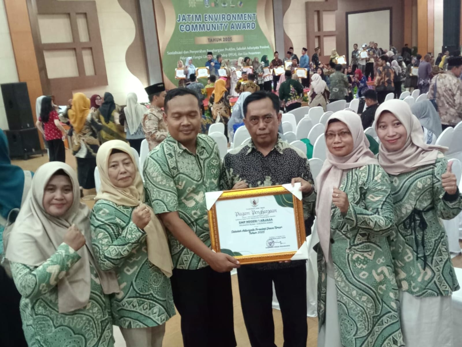 Alhamdulillah, setelah mendapatkan predikat sekolah Adiwiyata tingkat kabupaten pada tahun 2022. SMPN 1 Arjasa mendapatkan penghargaan sekolah Adiwiyata tingkat Propinsi Jawa Timur yang diserahkan dalam serangkaian acara “Jatim Environment Community Award” di gedung Graha Wisata Surabaya Dinas Pariwisata Propinsi Jawa Timur Jl.Wisata Mananggal No.38 Surabaya, Rabu 24/12/2025, terang Setiyo Martono.