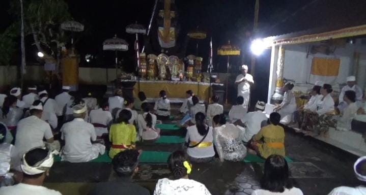 Pelaksanaan persembahyangan dalam rangka Piodalan di pimpin Pinandita Jro Mangku Bagus Suasana.